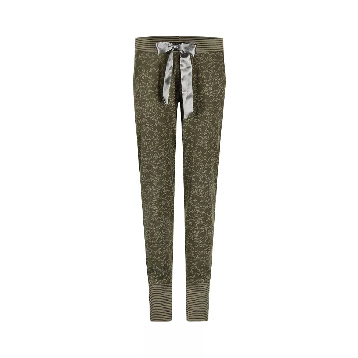 Deze leuke broek heeft een diep donkergroen met een subtiele bladerprint.