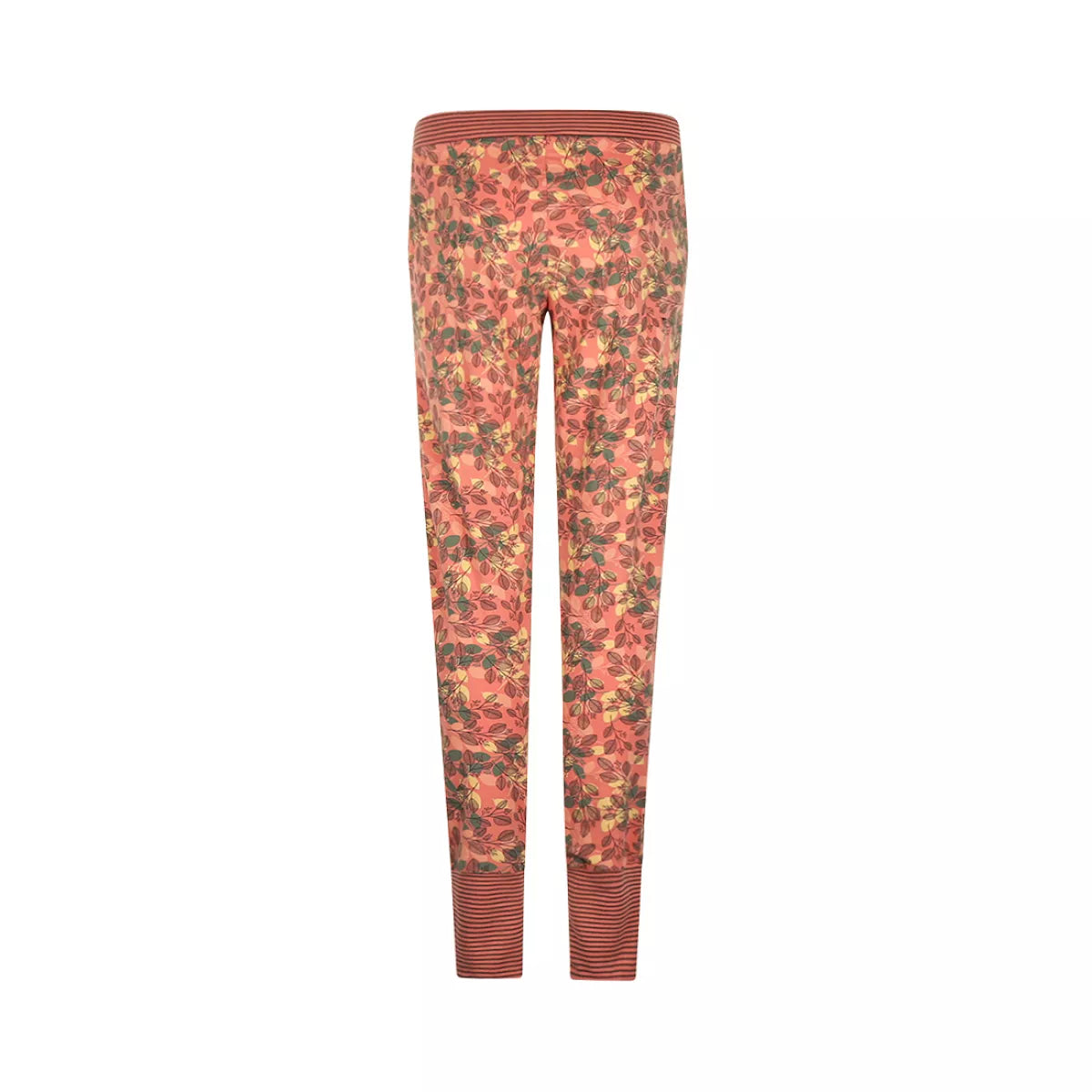 Deze leuke broek heeft een frisse, oranje ondergroend met een speelse print van takjes in zachtgeel en groen.