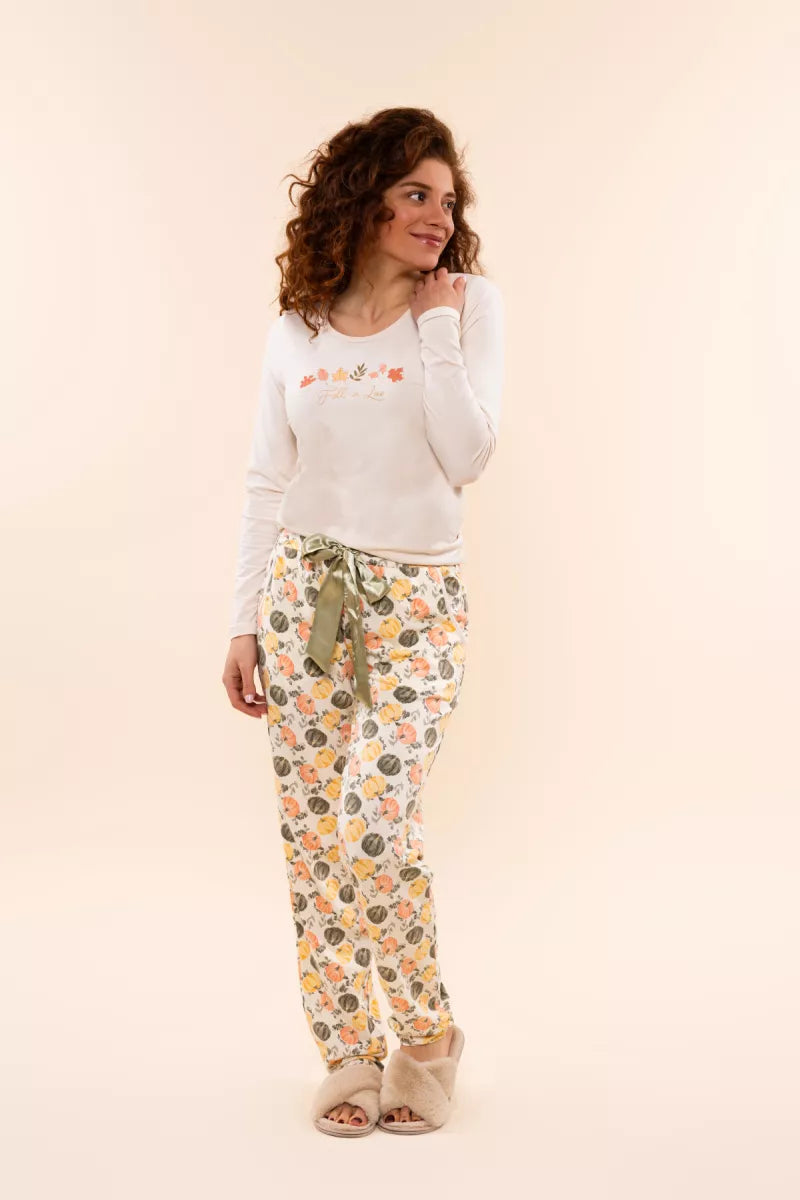Deze leuke broek heeft een herfstige all-over print van pompoenen in de kleuren geel, oranje en groen.