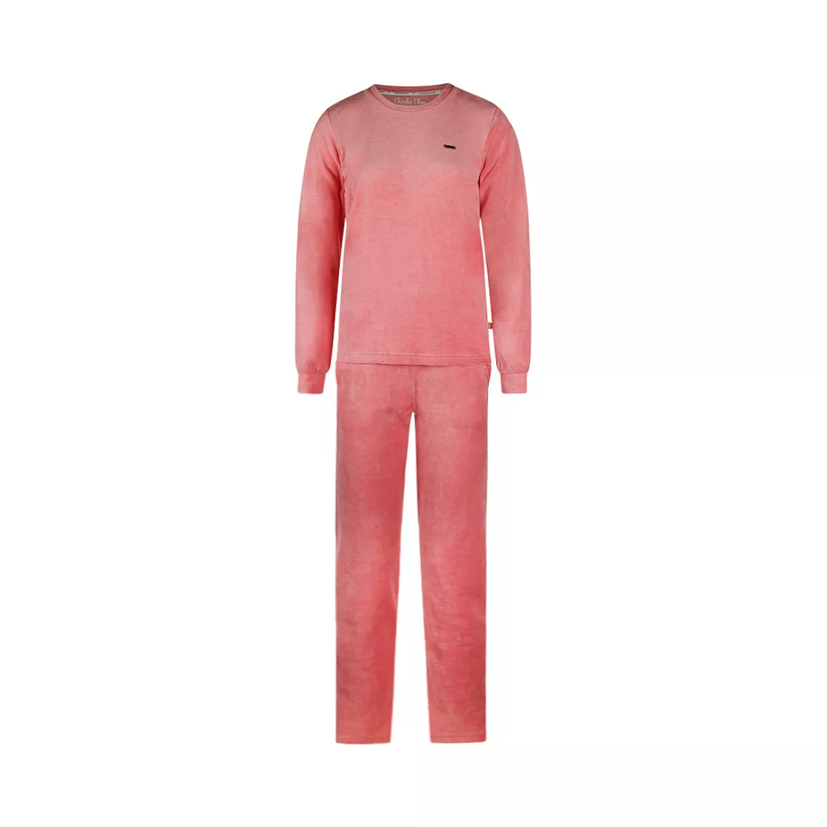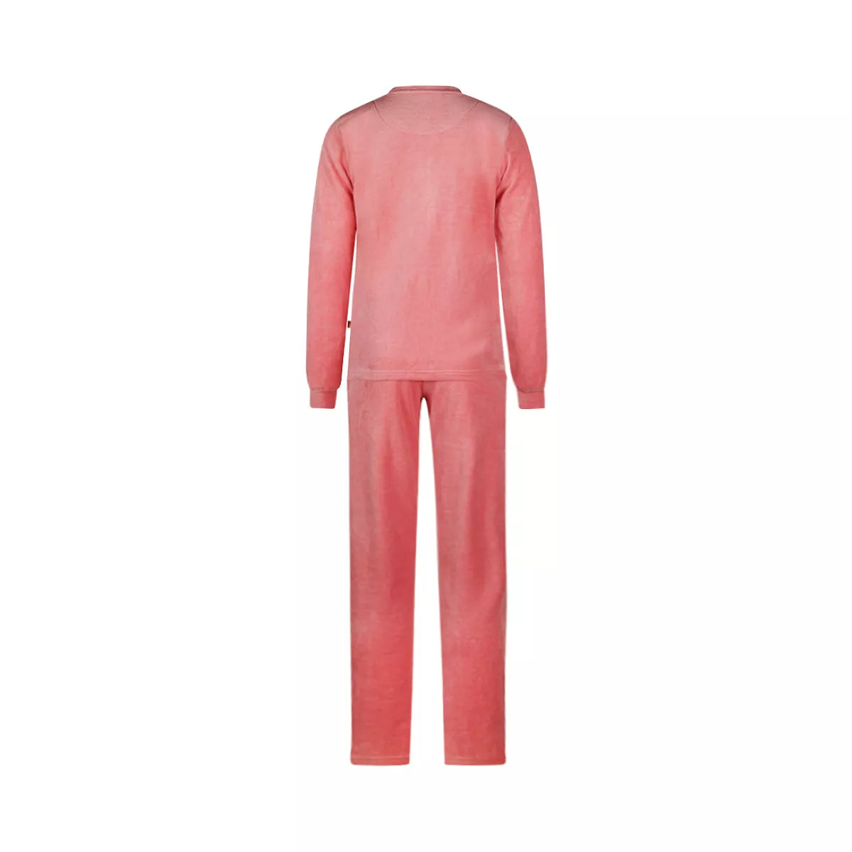 Dit roze huispak van velours is lekker zacht en warm.