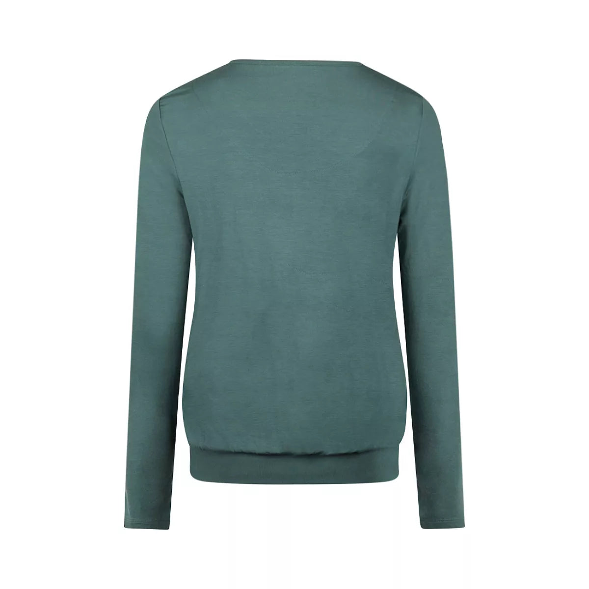 Dit effen shirt in een groenblauwe tint heeft lange mouwen en subtiele plooien bij de ronde hals.