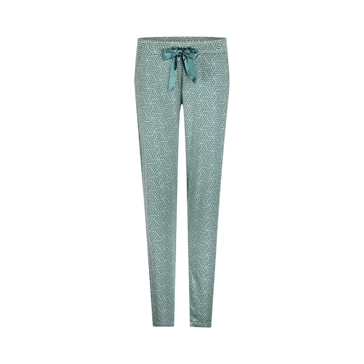 Deze leuke broek heeft een grafische all-over print in petrol, op een lichtblauwe ondergrond.