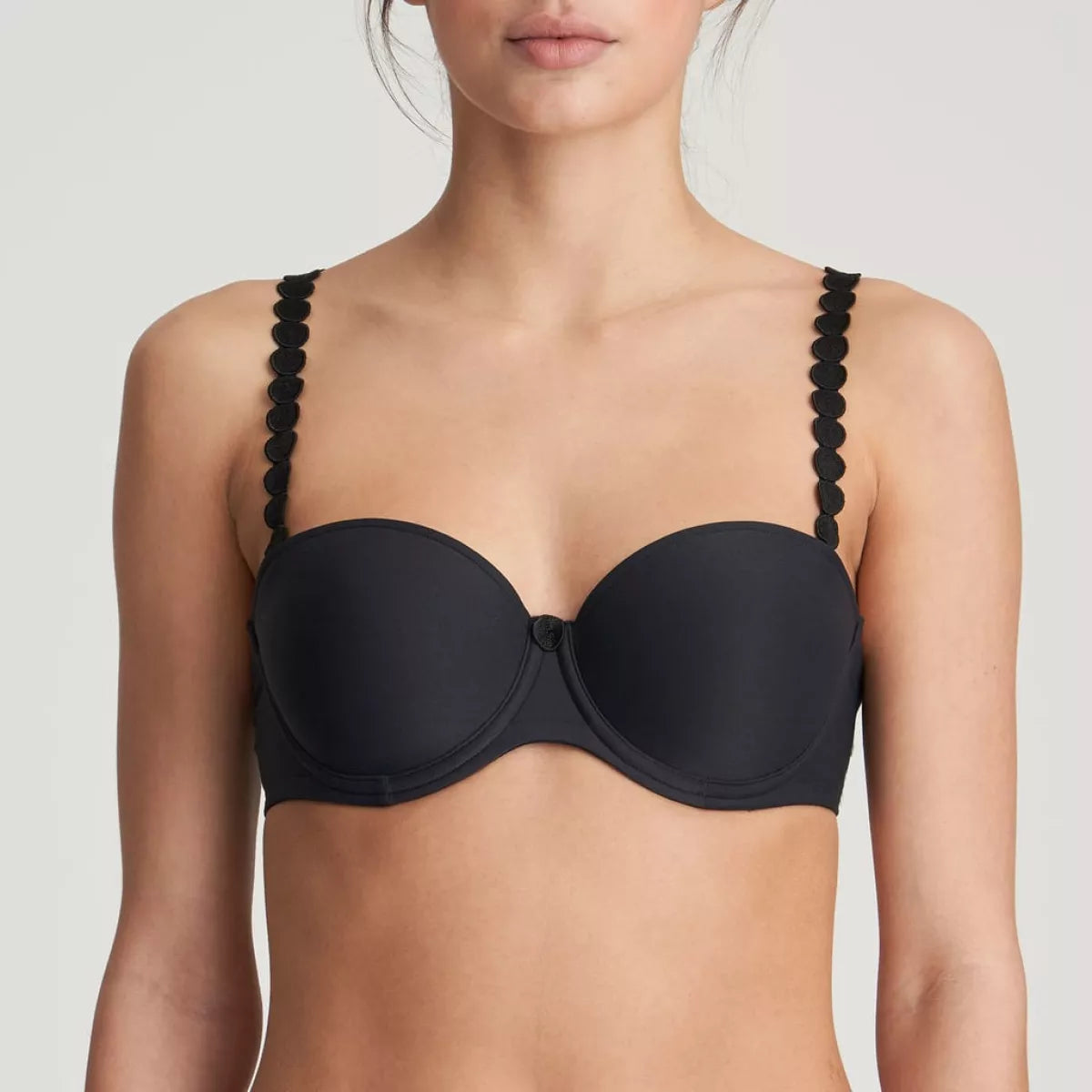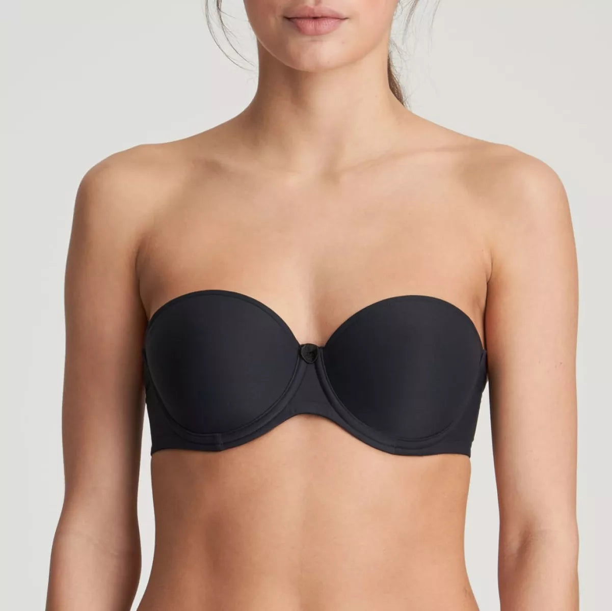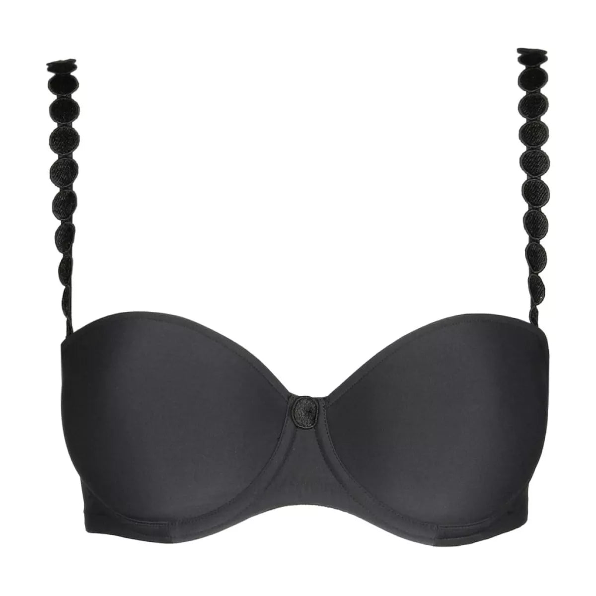 Strapless bh met de belijning van een bandeaucup. De rechte rug heeft een bredere elastische band dat in combinatie met de stof zorgt voor extra steun.