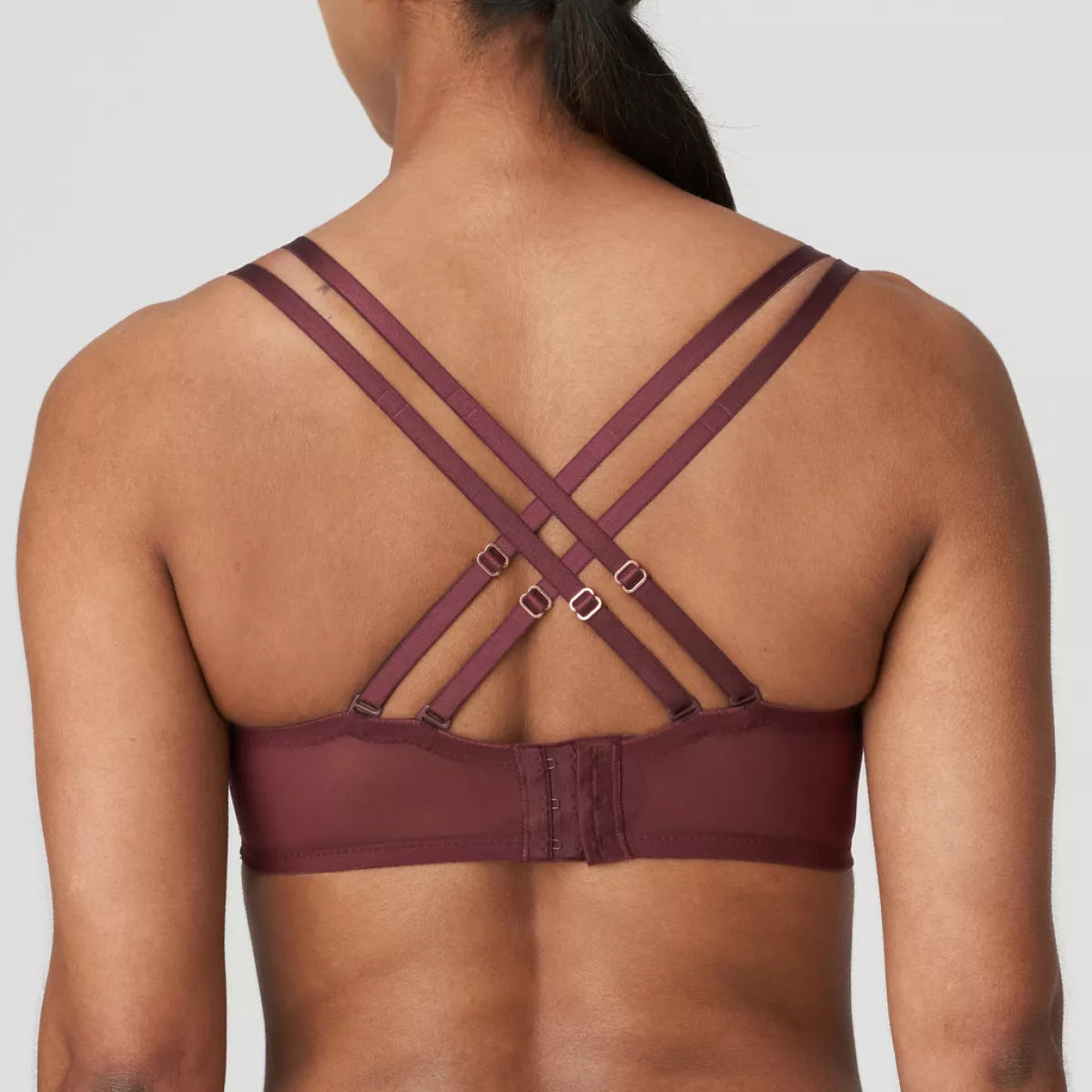 Een mousse balconnet met kantdrapage die de illusie creëert van een diep decolleté. De schouderbandjes kan je recht of gekruist dragen.