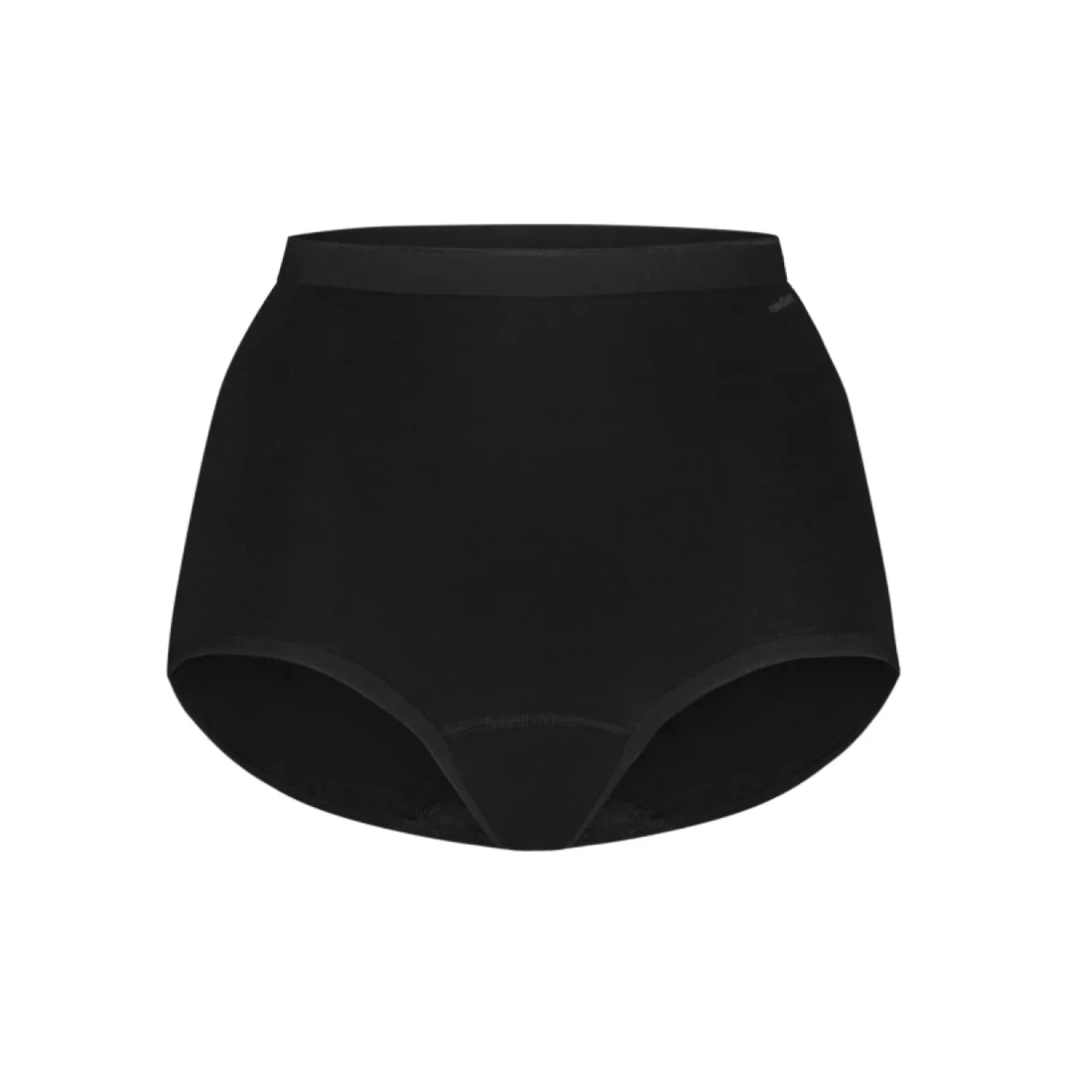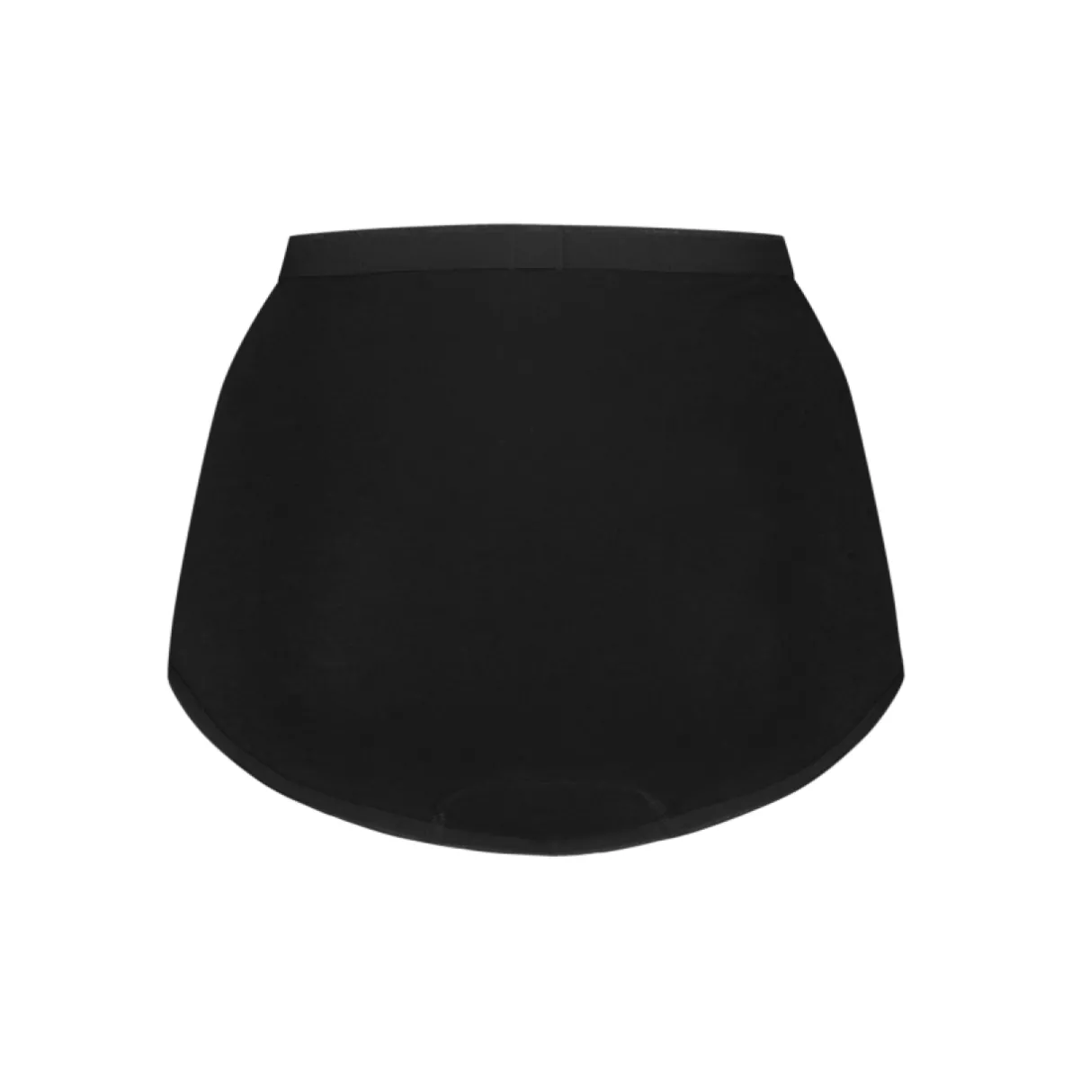 Het High Waist model valt hoog in de taille, sluit recht aan in de lies en heeft een badstof kruisje.
