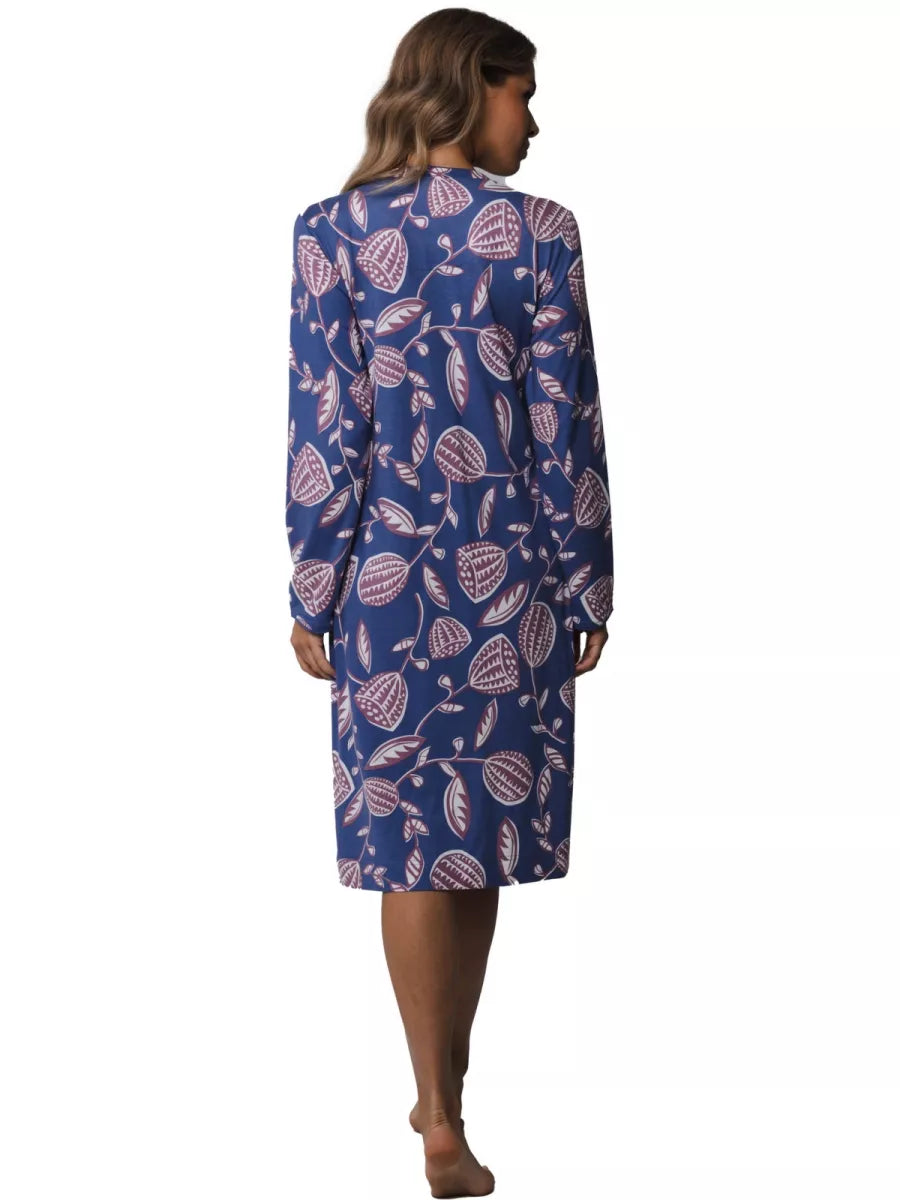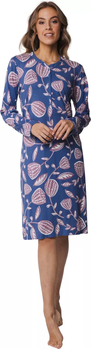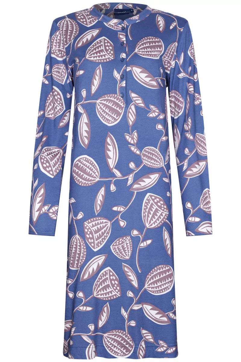 Dit nachthemd heeft een ronde hals met knoopsluiting en lange mouwen.