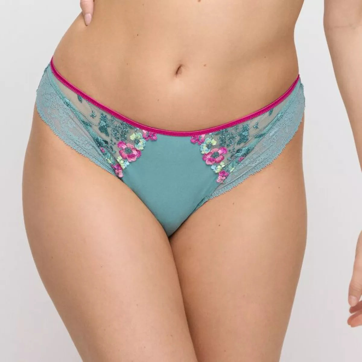 Aan de voorkant steelt de kleurige broderie de show, gecombineert met gladde microvezel en zacht kant.