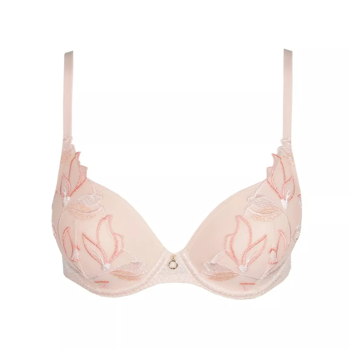 Je herkent deze bh aan de hartvormige belijning van de mousse cups. Die lopen van diep in het middenstukje in een golfje naar de schouderbandjes.