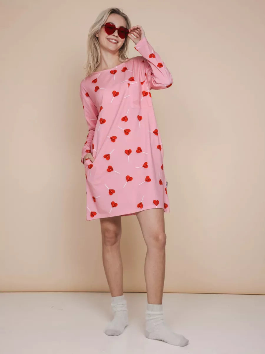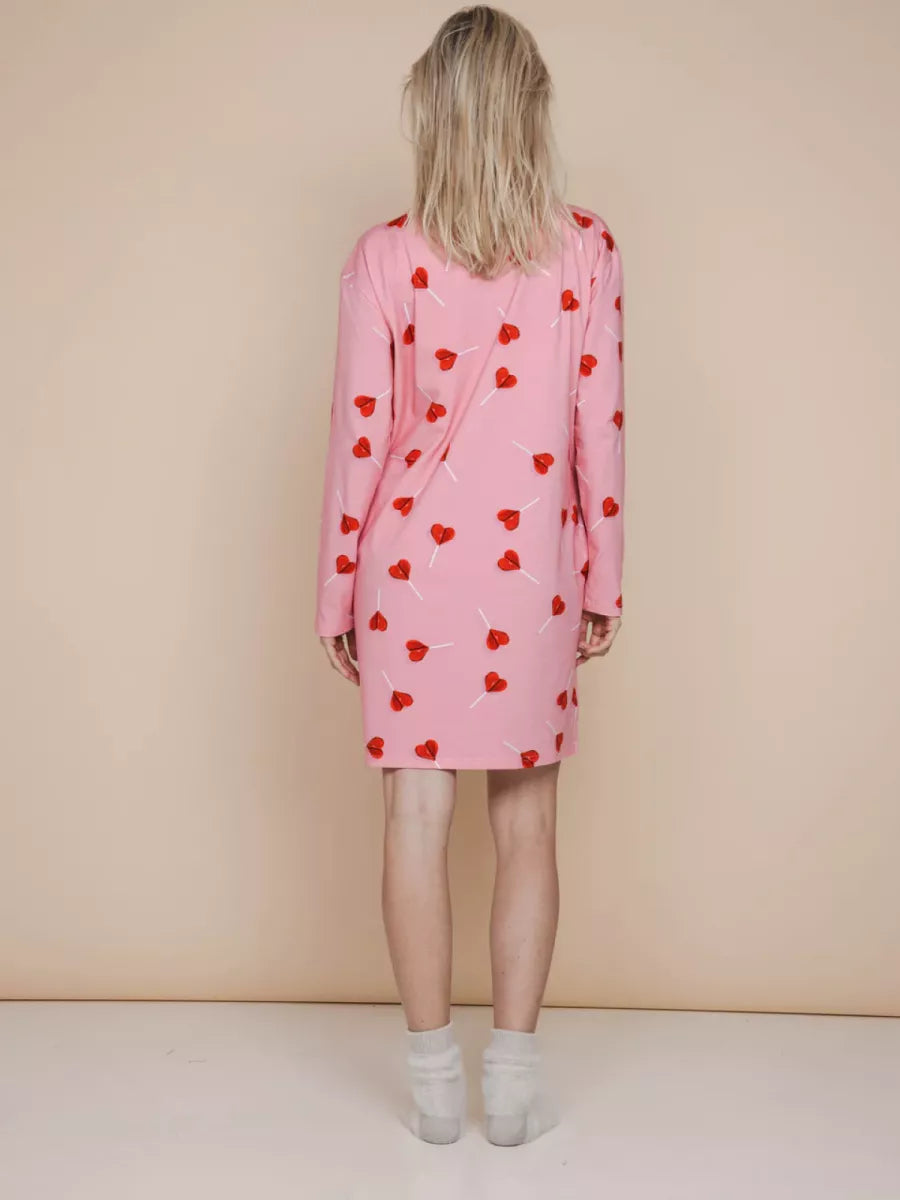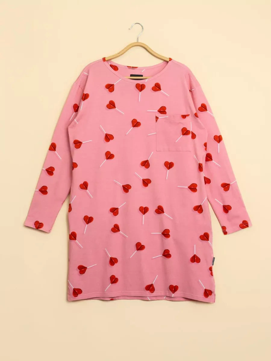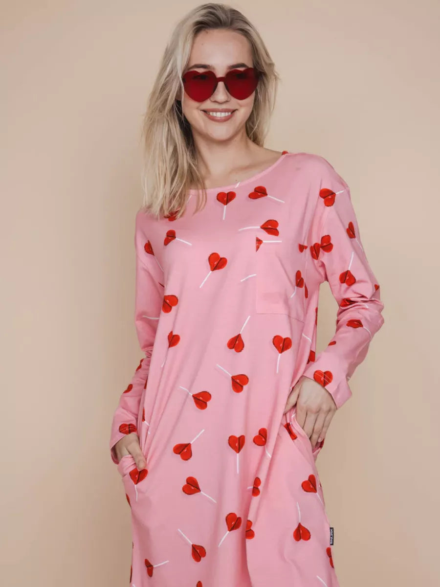 Alle gekheid op een stokje! Deze print van fel rode hartjeslollies op roze achtergrond zijn toch te gezellig? Zoet, vrolijk en bomvol good-vibes. Of je nu heel klein bent of groot, hier gaat elk hartje sneller van kloppen.