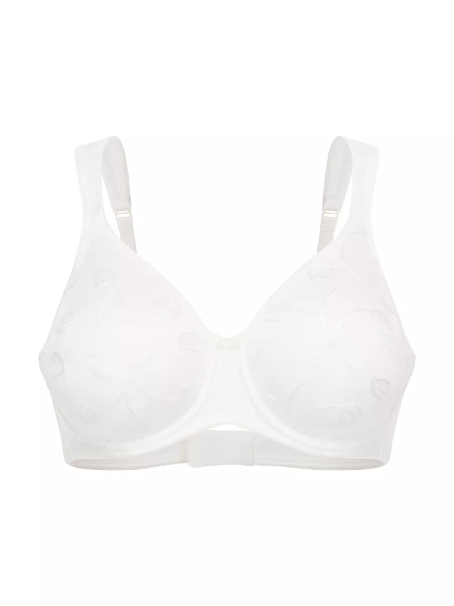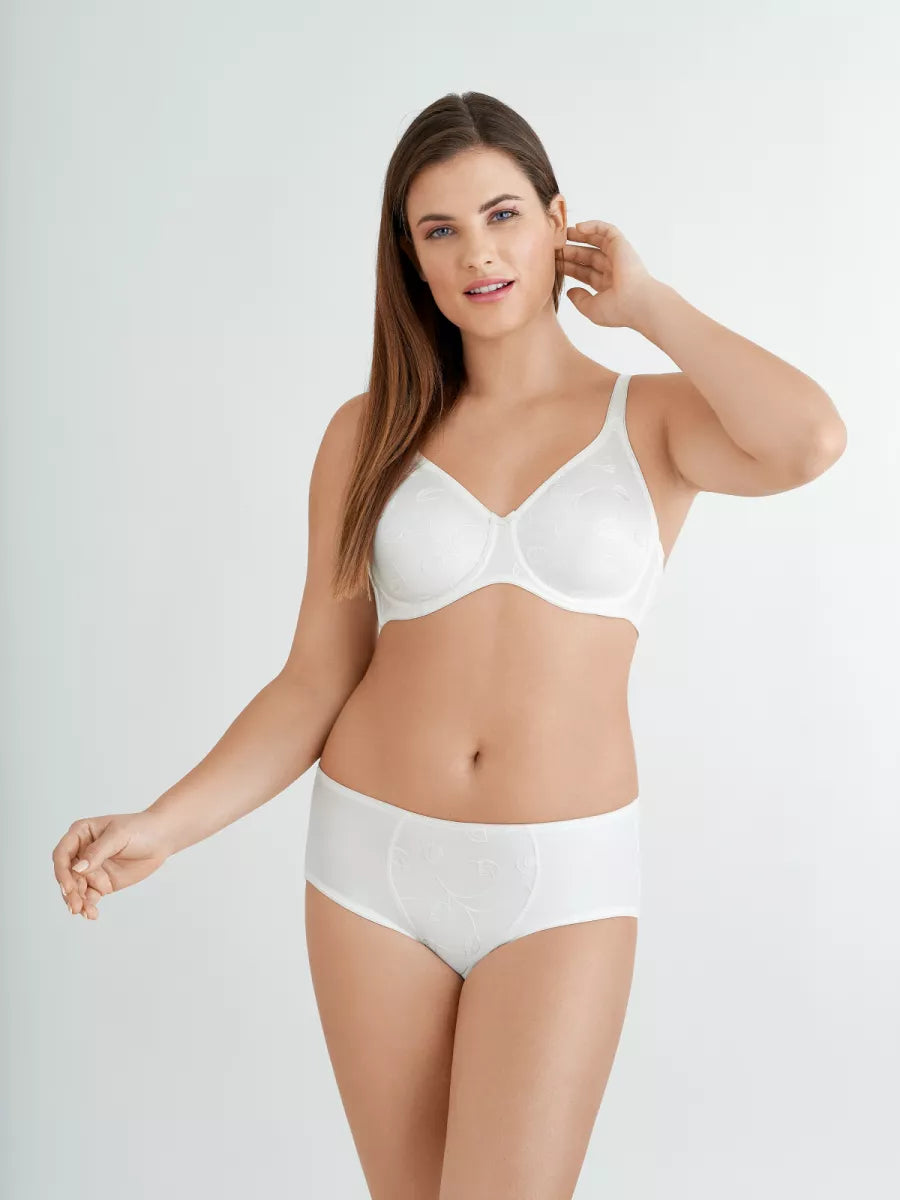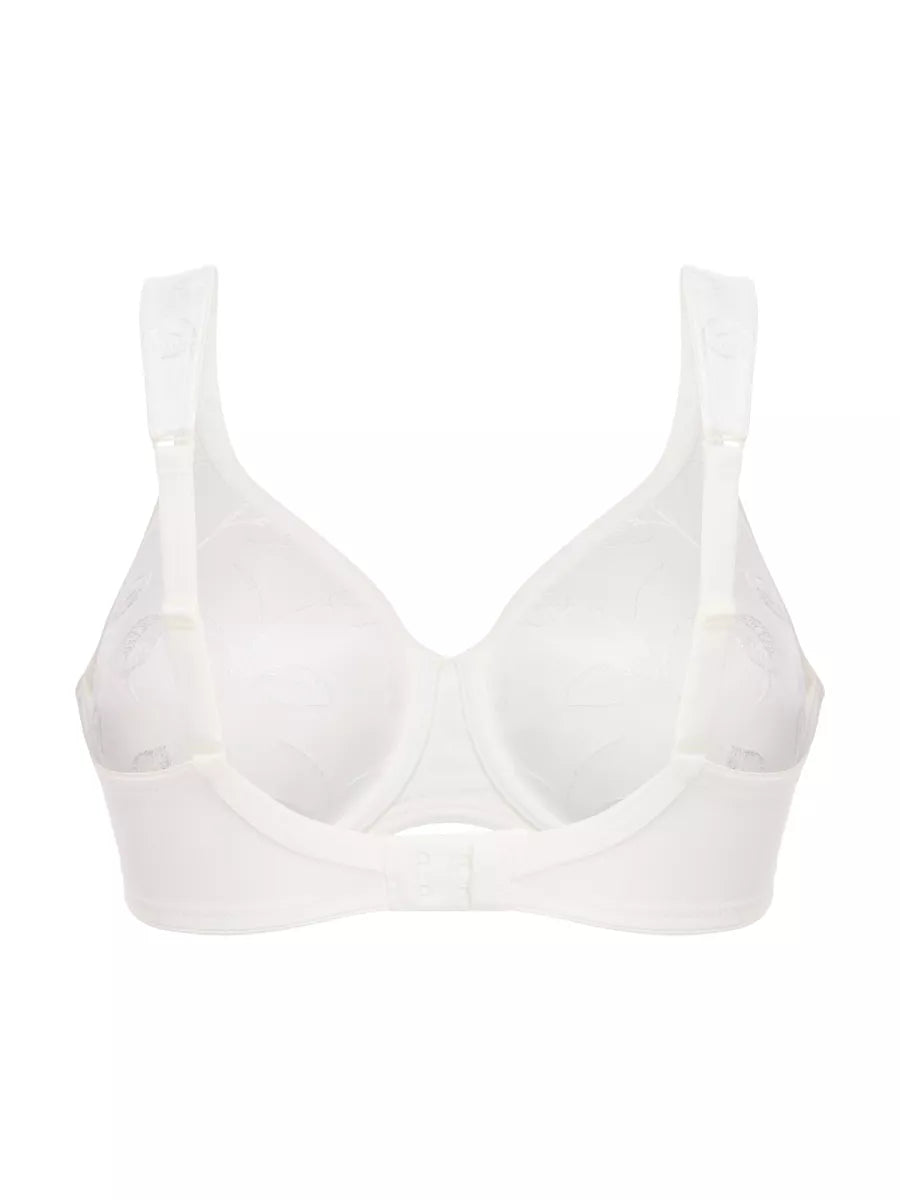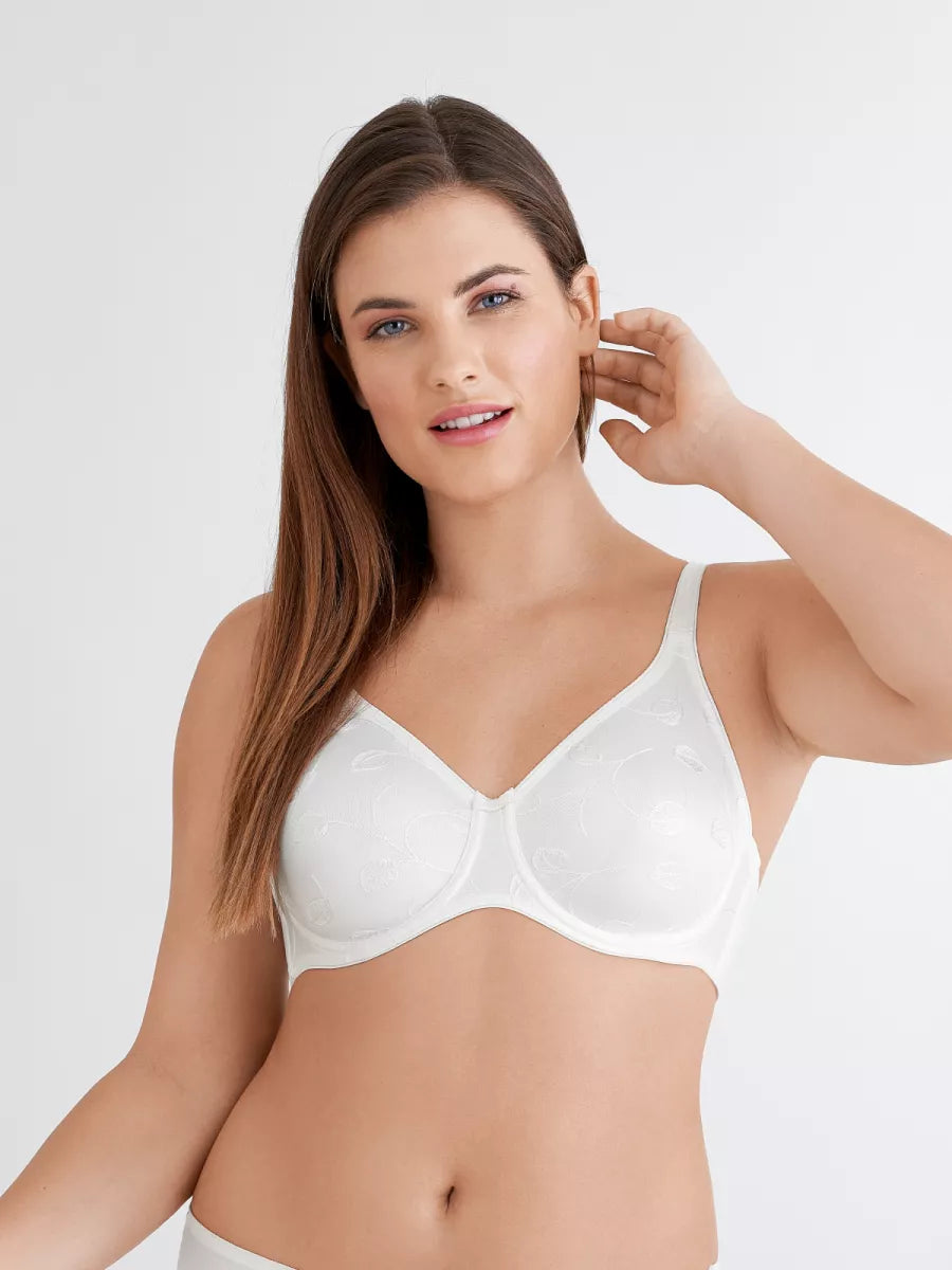 De naadloze, gladde cups van de bh “Emotions” hebben een elegant ingenaaid bladmotief, wat niet zichtbaar is onder de kleding.