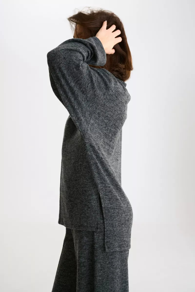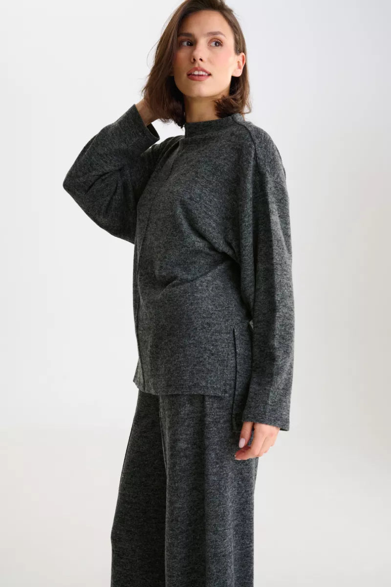 Deze lekkere, warme trui met lange mouwen heeft een iets opstaand kraagje en valt ruim op de schouders.