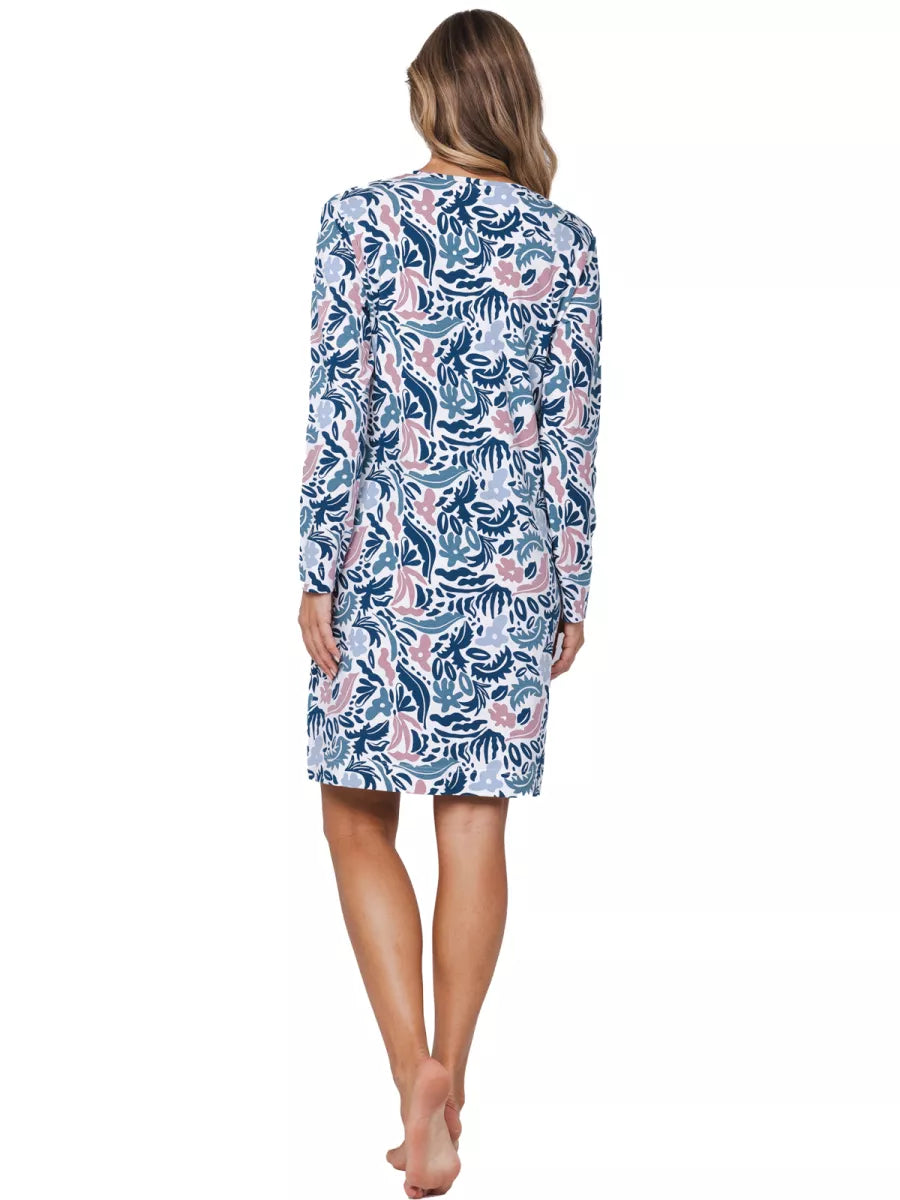 De abstracte fantasiefiguurtjes in oudroze en verschillende blauwtinten, geven dit nachthemd een romantische uitstraling.