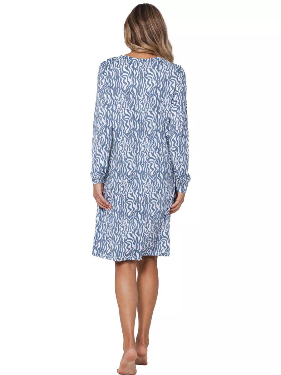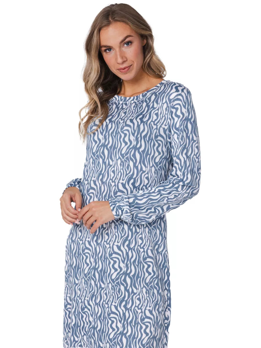Door het zacht golvende patroon in wit en lichtblauw, en het gebreide materiaal, oogt èn voelt dit nachthemd heerlijk zacht aan.