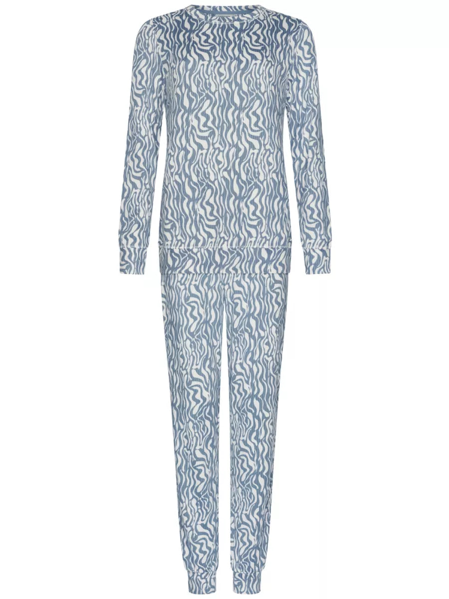 Door het zacht golvende patroon in wit en lichtblauw, en het gebreide materiaal, oogt èn voelt deze pyjama heerlijk zacht aan.