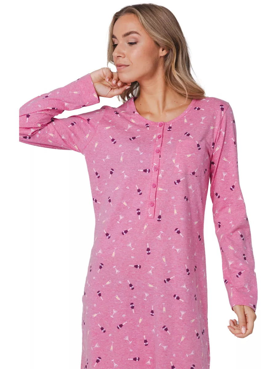 Dit nachthemd heeft een ronde hals met knopenrij, een borstzakje en lange mouwen.