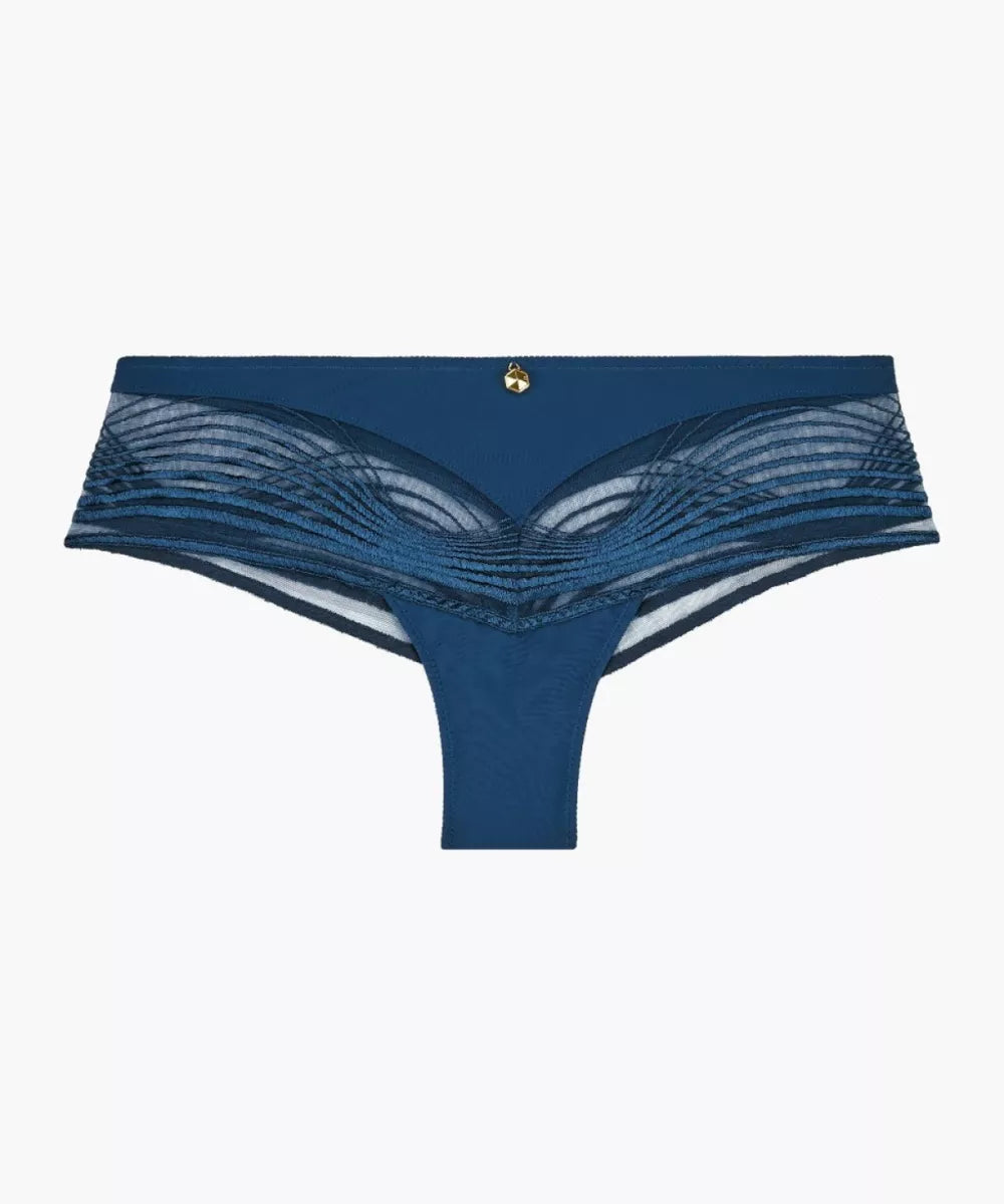 De voorzijde van deze hipster is een combinatie van zachte microvezel met een een klein gouden juweeltje en het golvende lijnenspel van de broderie op doorzichtig tule.