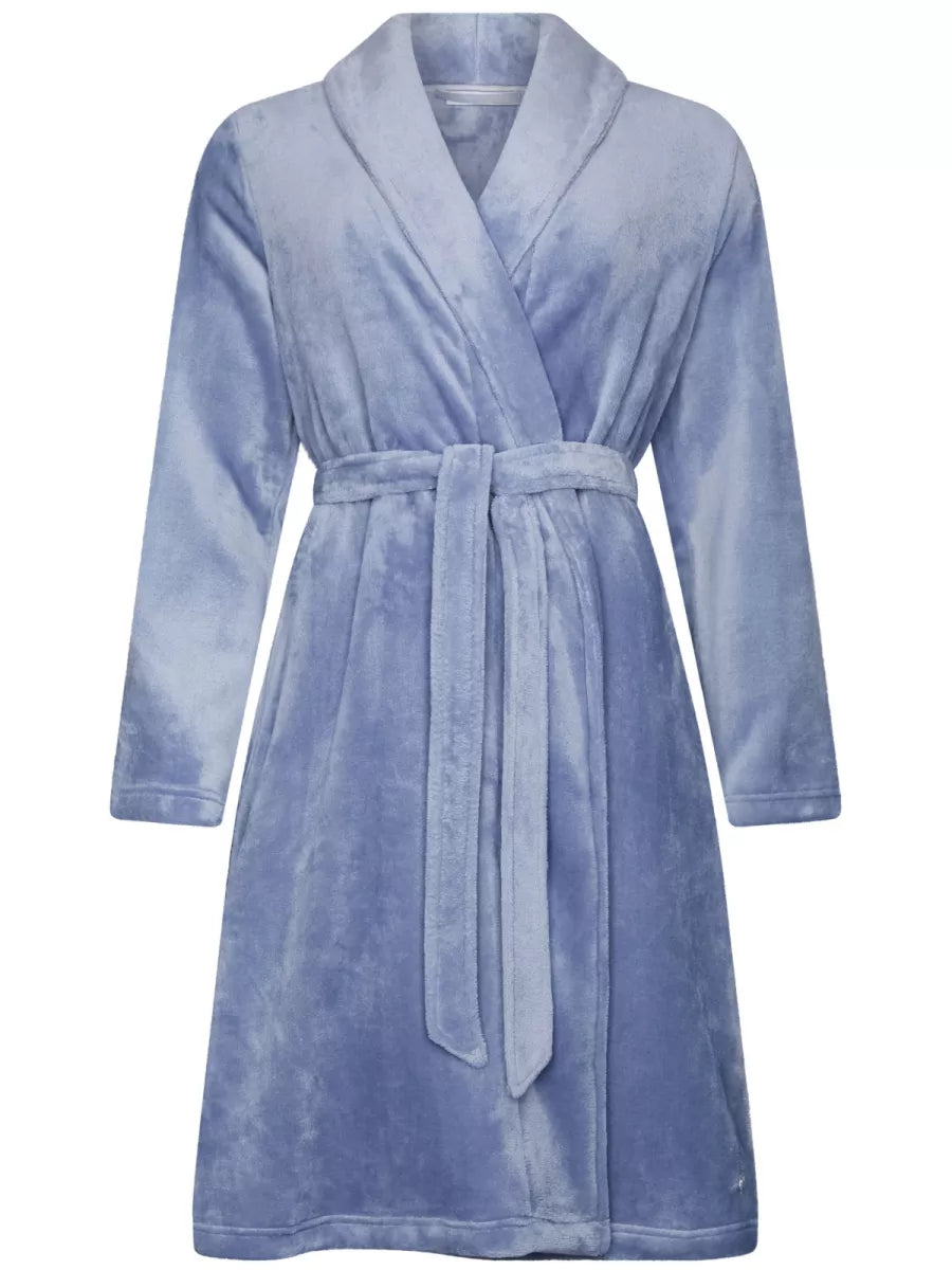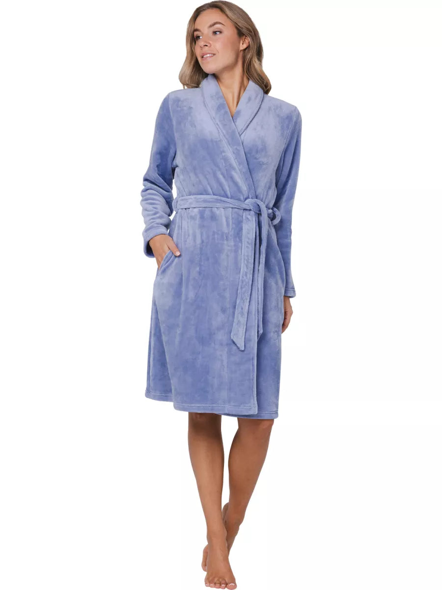 Dit model heeft een sjaalkraag, twee steekzakken en een ceintuur.