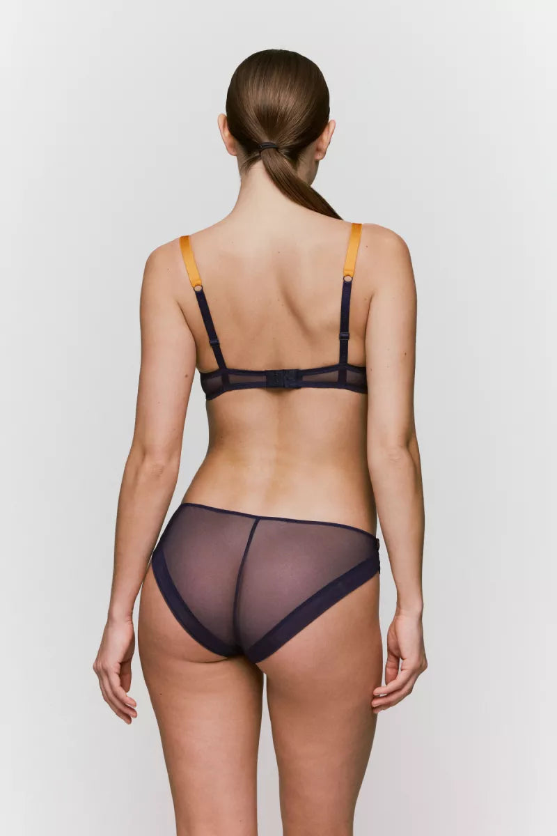 - gedruft door de onverwachte kleurencombinatie van donkerblauw met warmgele bandjes;
