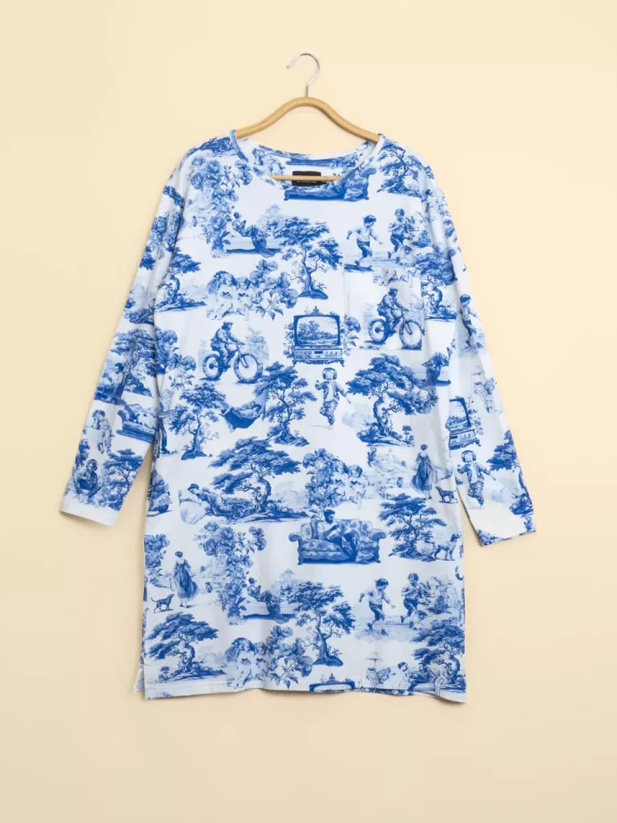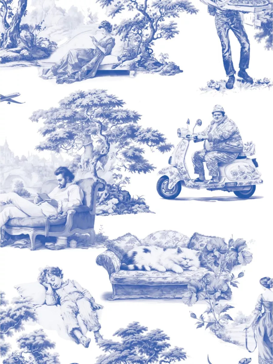 Wat op het eerste gezicht een traditionele Toile de Jouy patroon lijkt, blijkt bij nader inzien een ode aan het moderne niksen. Spot jij de pizzaberzorger, koptelefoon, e-reader en de gamende kinderen?