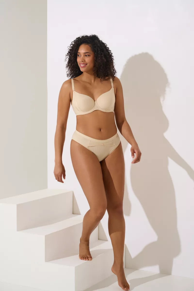 Deze bh heeft beugels, voorgevormde cups en een vrouwelijke belijning.