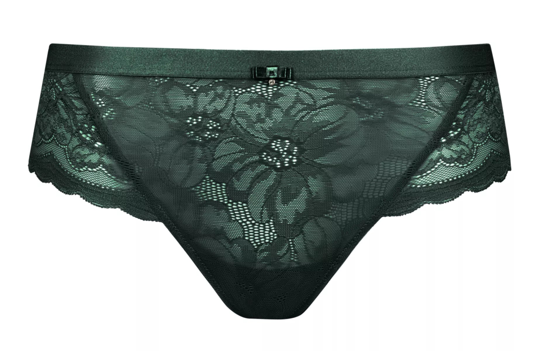 Dit modelletje heeft een voorzijde van kant, en gladde achterkant afgewerkt met kant langs de billen.