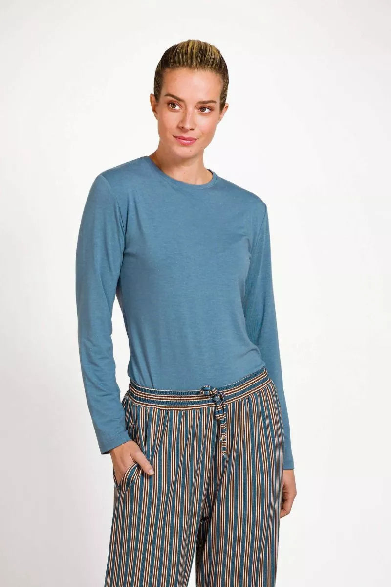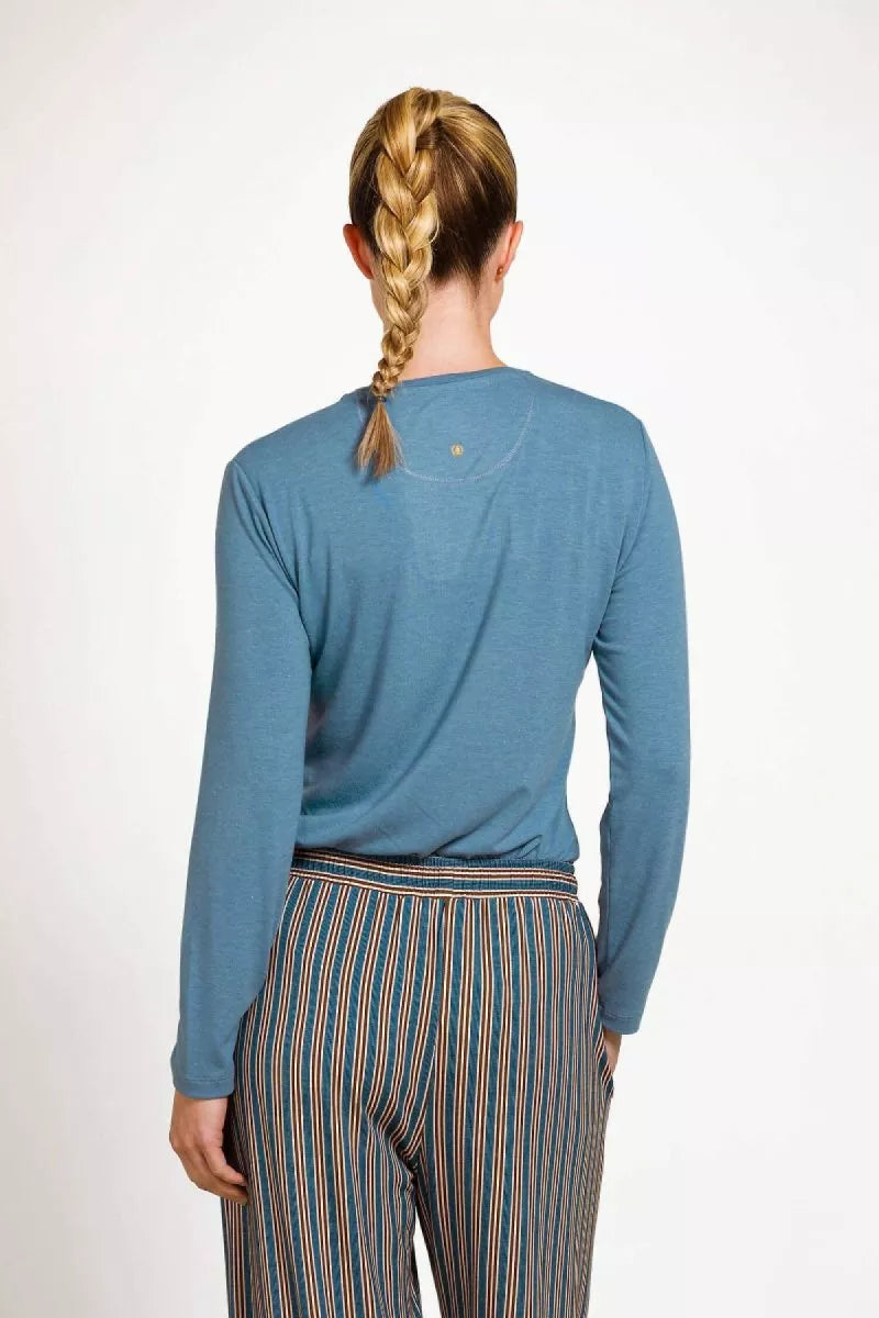 Dit uni shirt heeft een wat hogere, ronde hals, lange mouwen en valt getailleerd.