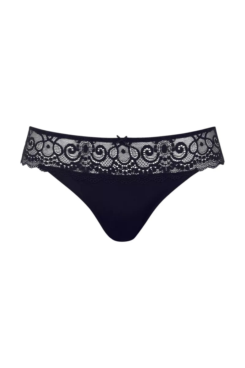 Dit slipje valt laag op de buik en heeft rondom een brede rand kant.