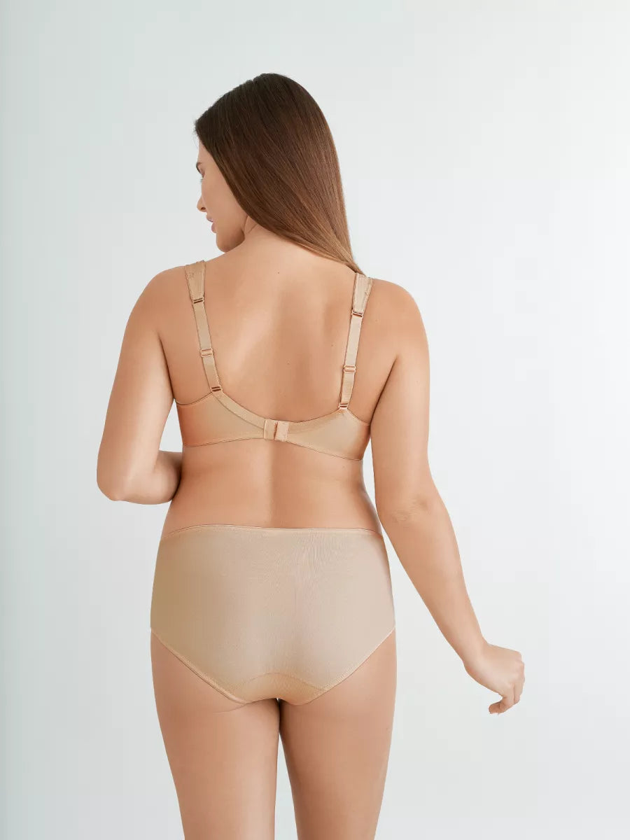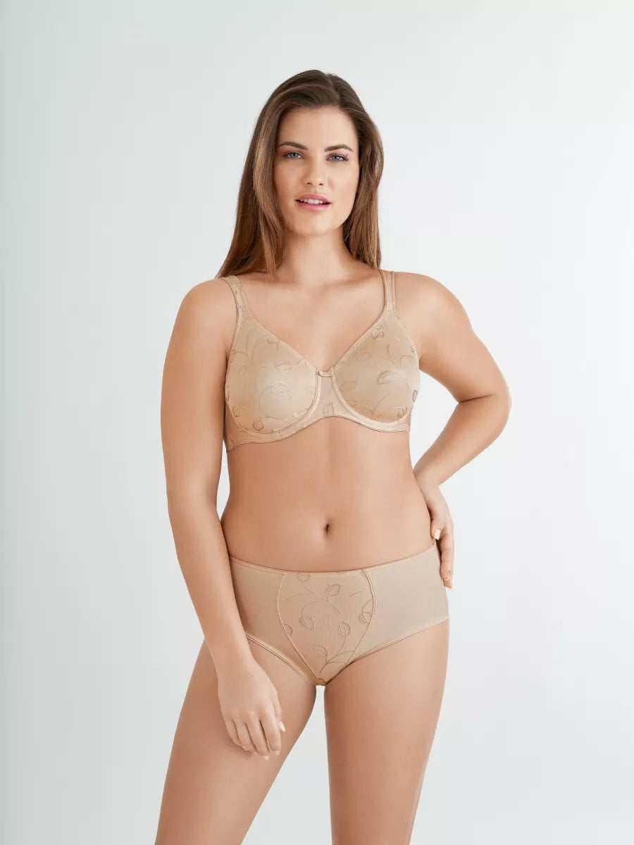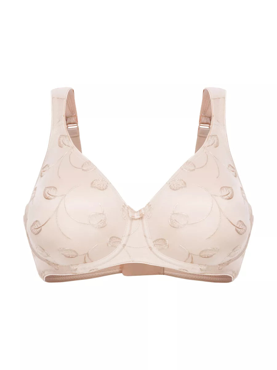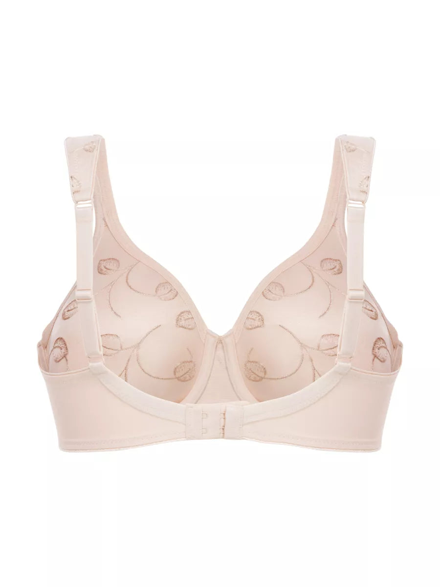 De naadloze, gladde cups van de bh “Emotions” hebben een elegant ingenaaid bladmotief, wat niet zichtbaar is onder de kleding.
